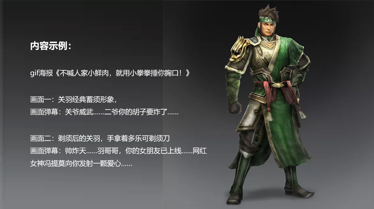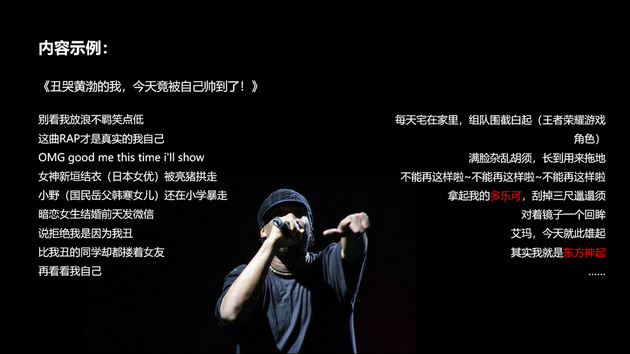 結(jié)合最流行元素; 創(chuàng)意病毒視頻;趣味對(duì)比評(píng)測(cè);RAP神曲,方言翻唱;中國(guó)古代歷史名人惡搞;多樂(lè)可的100種玩法……