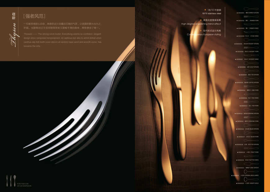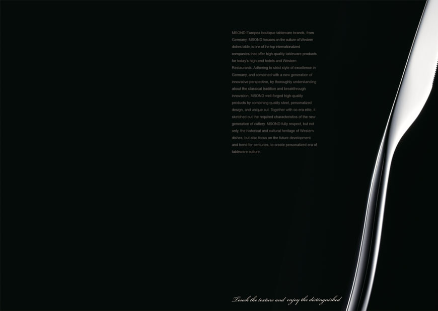 MSOND瑪圣達(dá)歐洲精品餐具品牌,源于德國。瑪圣達(dá)核心致力于西餐桌面文化,是為當(dāng)今高端酒店、西餐廳提供高品質(zhì)桌面用品的國際化公司之一。秉承德國精益求精的嚴(yán)謹(jǐn)作風(fēng),結(jié)合新生代的創(chuàng)新視角,憑借對傳承經(jīng)典,突破創(chuàng)新的理解,以優(yōu)質(zhì)的鋼材、個(gè)性的設(shè)計(jì)、獨(dú)特的切工,精心鍛造高品質(zhì)產(chǎn)品。與時(shí)代精英共同勾勒出新生代所需的特色餐具。瑪圣達(dá)不僅充分尊重西餐餐具歷史文化的傳承,更著眼未來百年的發(fā)展走向,開創(chuàng)個(gè)性時(shí)代。