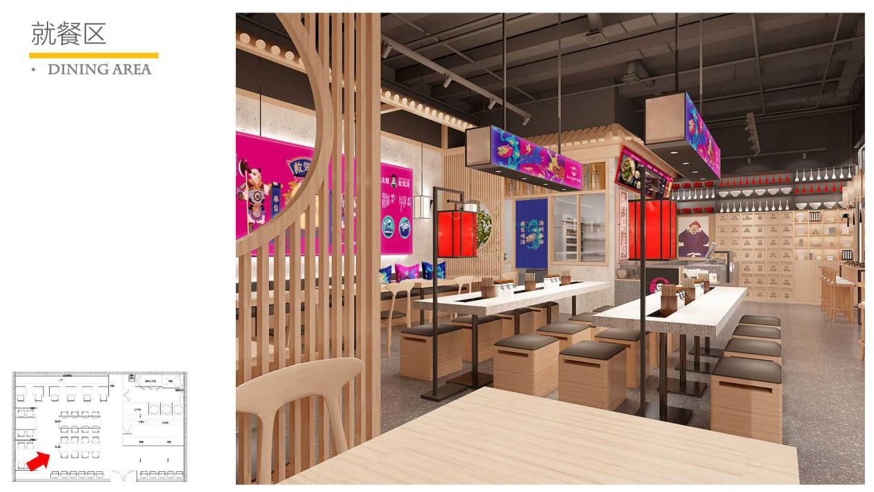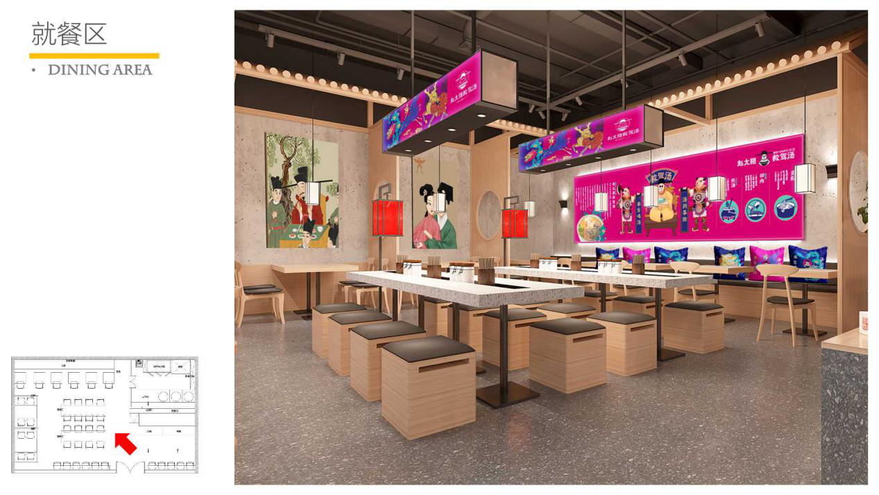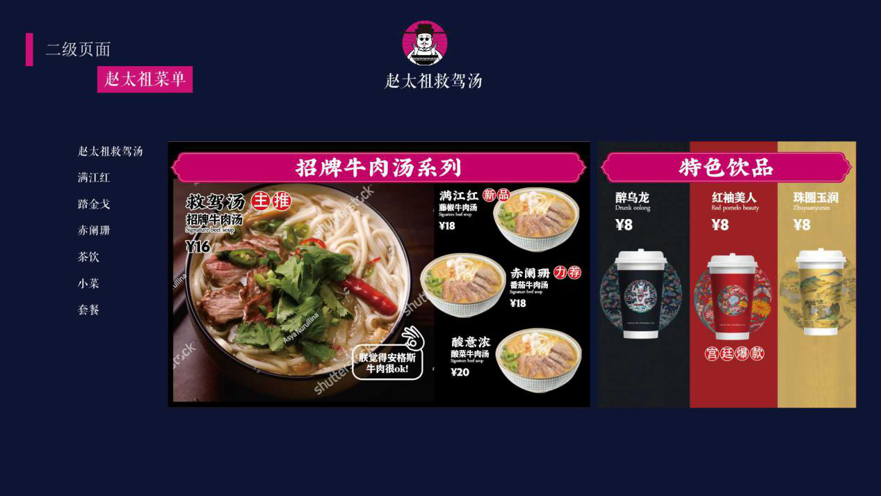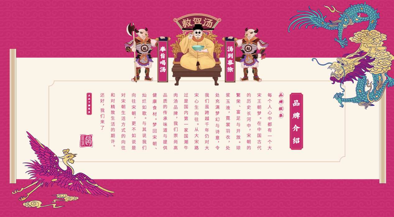 趙太祖救駕湯定位明確,告別傳統(tǒng)門(mén)店,打造新形象,趙太祖繼承宋朝美學(xué),將大紅燈籠、中式屏風(fēng)、龍鳳畫(huà)軸、太師椅各種古典的中國(guó)風(fēng)元素結(jié)合身處其中,打造舒適的就餐環(huán)境,營(yíng)造宋朝美學(xué)的中國(guó)風(fēng)。用美食連接中國(guó)傳統(tǒng)文化。