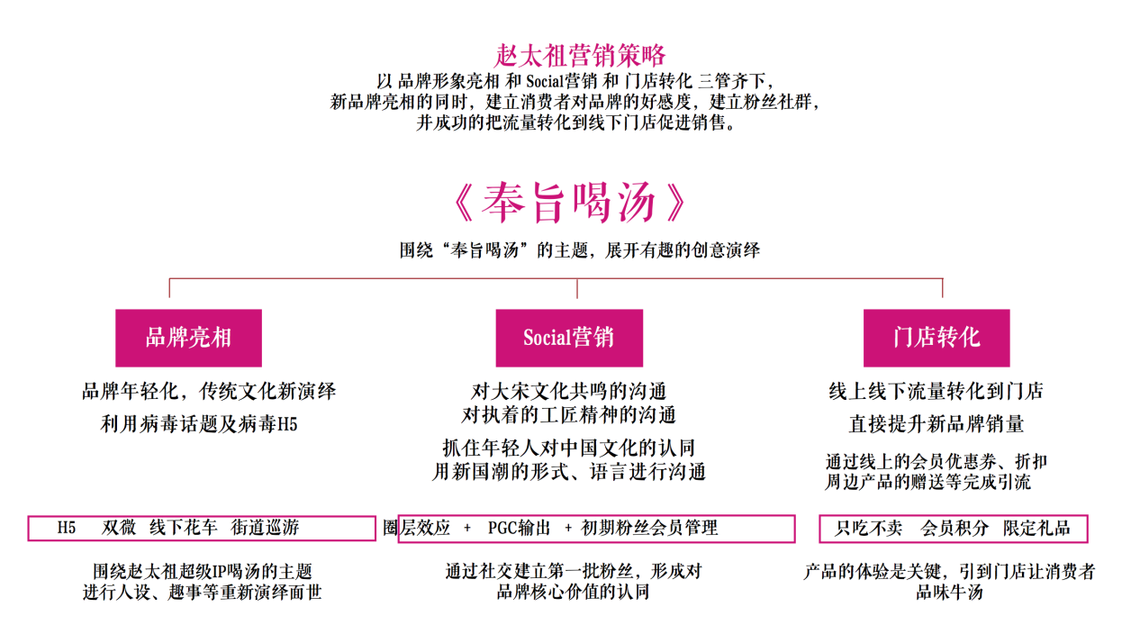 趙太祖營(yíng)銷(xiāo)策略:以“品牌形象亮相”和“Social營(yíng)銷(xiāo)”和 “門(mén)店轉(zhuǎn)化”三管齊下,新品牌亮相的同時(shí),建立消費(fèi)者對(duì)品牌的好感度,建立粉絲社群,并成功的把流量轉(zhuǎn)化到線(xiàn)下門(mén)店促進(jìn)銷(xiāo)售。
