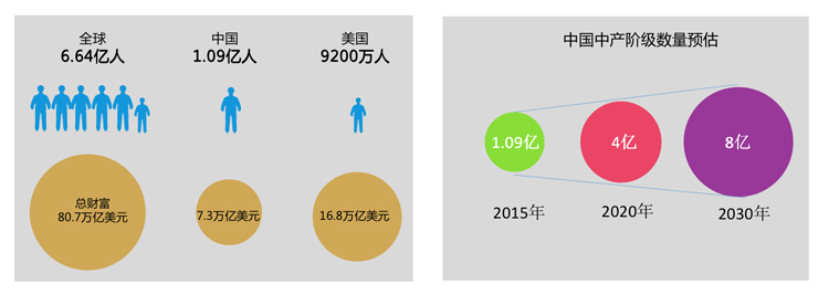 2015年瑞士投行瑞信發(fā)表的《全球財(cái)富報(bào)告》, 其中核心數(shù)據(jù)為中國(guó)中產(chǎn)階級(jí)人數(shù)達(dá)1.09億名,已經(jīng)超過(guò)美國(guó)9200萬(wàn)名,居全球第一位,但所持總財(cái)富僅為7.3萬(wàn)億美元,不足美國(guó)的一半。波士頓咨詢估計(jì),到2020年,中國(guó)中產(chǎn)階級(jí)及富裕消費(fèi)者數(shù)量將從1.09億增長(zhǎng)到4億以上,其中三分之二將居住在小城市。