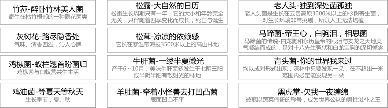 不同的野生菌菇的習(xí)性、生活環(huán)境等特點來給它們創(chuàng)意命名,讓消費者在讀野生菌菇名字的時候,可以在腦海里勾畫出不同的場景,以便更好的記住此野生菌菇。