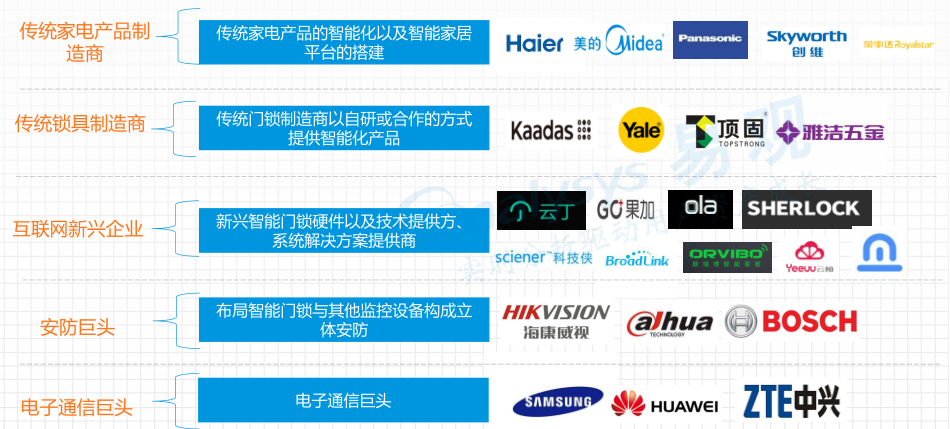 截止至2018年6月底,我國(guó)智能門鎖品牌已經(jīng)超過(guò)3500家,生產(chǎn)企業(yè)超過(guò)1500家。智能鎖品牌企業(yè)總體上可以被分為五個(gè)大類:
